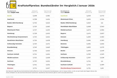 München(ots) - Im Vergleich zu anderen Bundesländern können die Autofahrerinnen und Autofahrer in Berlin und im Saarland derzeit etwas günstiger tanken. Am tiefsten in die Tasche greifen muss man hingegen in Bremen und in Mecklenburg-Vorpommern - hier sind die Kraftstoffpreise um durchschnittlich 7,6 Cent (Benzin) bzw. 8,1 Cent (Diesel) teurer. Das zeigt die aktuelle ADAC Auswertung der Kraftstoffpreise in den 16 deutschen…